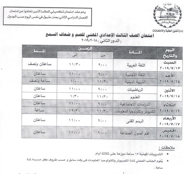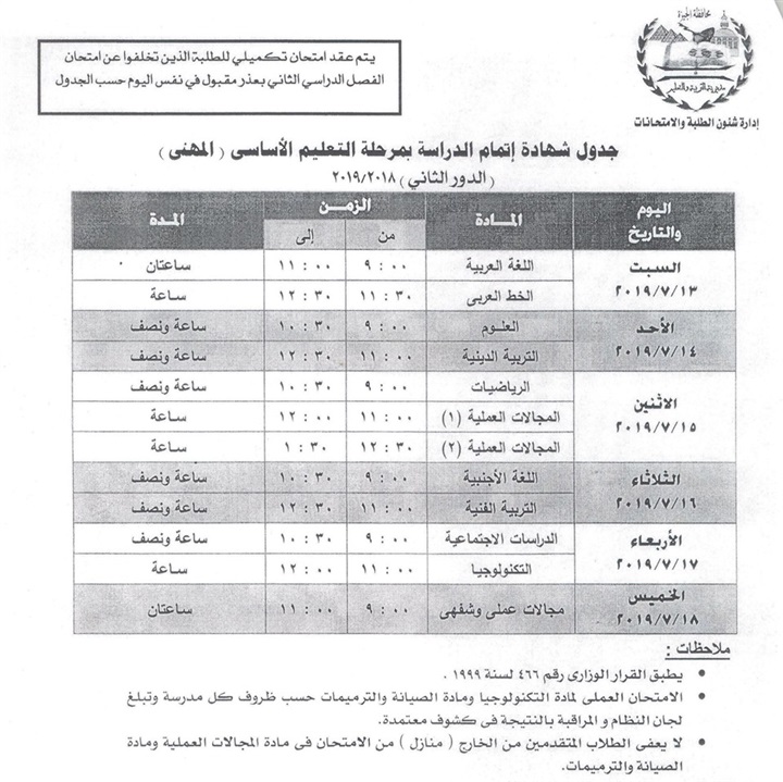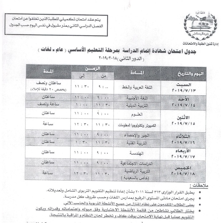 اعتمد اللواء ، أحمد راشد – محافظ الجيزة، جدول مواعيد امتحانات الدور الثانى للعام الدراسى 2019/2018 على أن تبدء الامتحانات ،يوم السبت الموافق 2019/7/6 وتنتهى يوم الاحد الموافق 2019/7/21