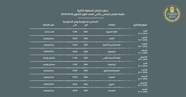 اعلنت وزارة التربية والتعليم عن جدول الدور الثانى لطلبة الصف الاول الثانوي على ان تبدا الامتحانات يوم 14 يوليو حتي 27 من نفس الشهر