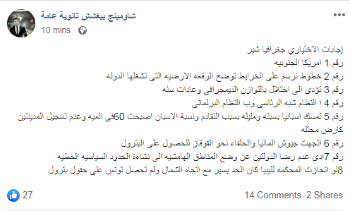 نشرت إحدى صفحات الغش عبر مواقع التواصل الاجتماعي، اجابة اسئلة ، زعمت أنه خاص بامتحان مادة الجغرافيا، التي يؤديها طلاب الثانوية العامة الشعبة الادبية حاليا.