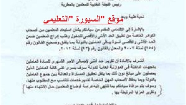 اثار الخطاب المرسل من ناجي الاشقر رئيس الادارة المركزية لشئون المكتب الفني لوزير المالية الي الدكتور محمد زهران نقيب رئيس اللجنة النقابة للمعلمين بالمطرية اليوم " الخميس " جدلا واسعا بين اوساط المعلمين