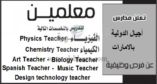 تعلن مدرسة أجيال الإماراتية عن وظائف جديدة للمعلمين والمعلمات وذلك وفقا لنص الإعلان التالي: :