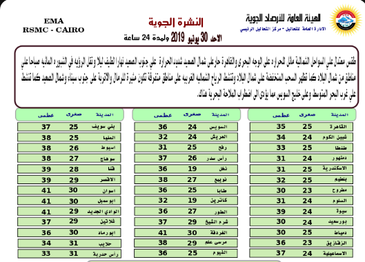 اعلن خبراء هيئة الأرصاد الجوية، انه من المتوقع أن يسود اليوم الأحد، طقس معتدل على السواحل الشمالية مائل للحرارة على الوجه البحرى والقاهرة، حار على شمال الصعيد شديد الحرارة على جنوب الصعيد نهارا لطيف ليلا، وتقل الرؤية فى الشبورة المائية صباحا على مناطق من شمال البلاد.