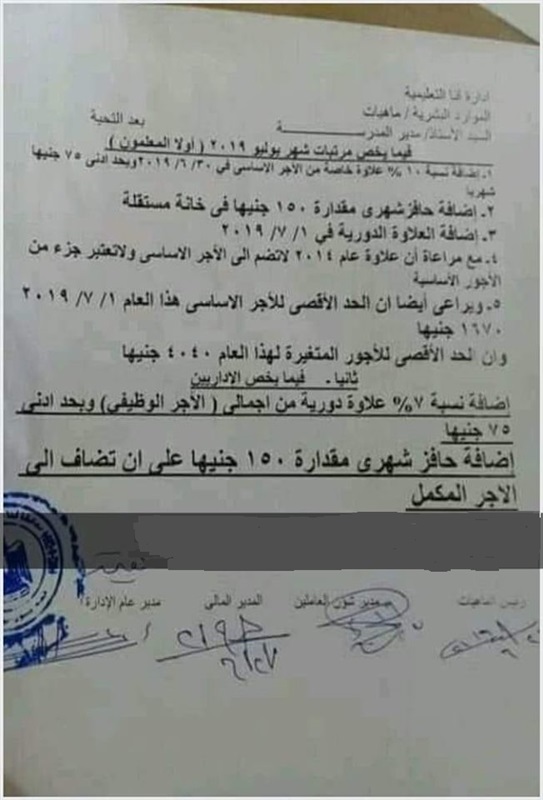 اضافه ١٠٪ من الاجر الاساسى فى ٣٠/٦/٢٠١٩ وبحد ادنى ٧٥ جنيها شهريا