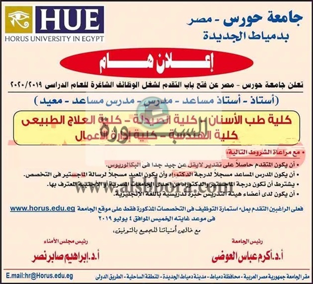 تعلن جامعة حورس بدمياط الجديدة وظائف جديدة لأعضاء هيئة التدريس فى 5 كليات "من حملة الماجستير والدكتوراه" وذلك وفقا لنص الإعلان التالي: