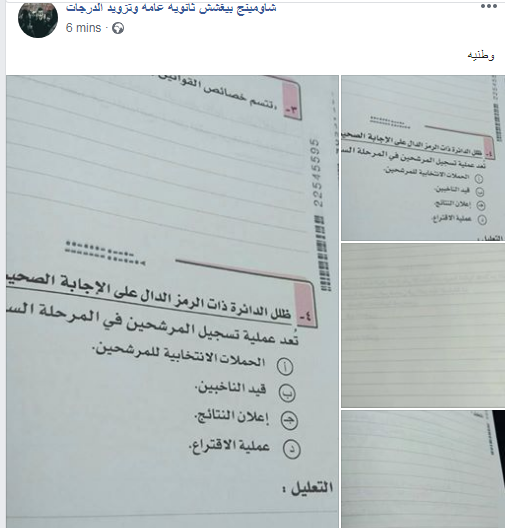 نشرت صفحات الغش على مواقع التواصل الاجتماعى "فيس بوك" نموذج امتحان التربية الوطنية بعد اقل من 10دقائق من انطلاق الامتحان