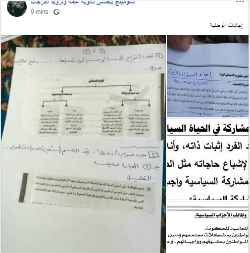 نشرت صفحات الغش على مواقع التواصل الاجتماعى "فيس بوك"اجابات امتحان التربية الوطنية بعد اقل من دقائق من انطلاق الامتحان الذى يؤدية طلاب الثانوية العامة الان