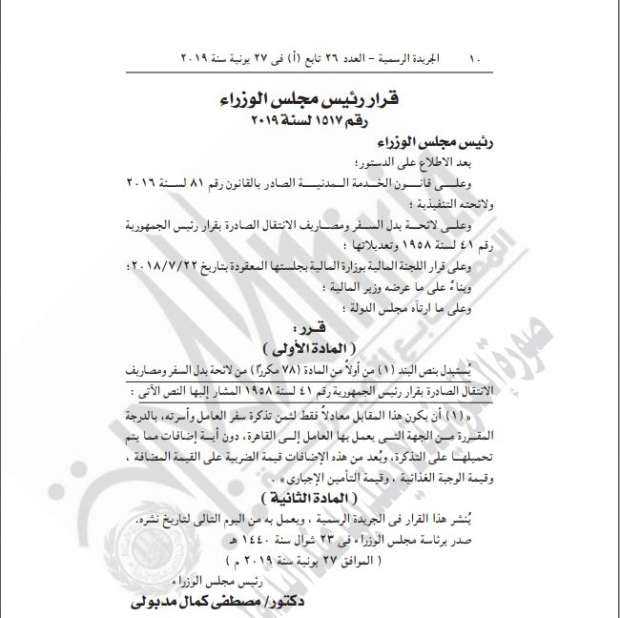 اصدر مجلس الوزراء قرارا عاجلا رقم 1517 لسنة 2019 بتعديل لائحة بدل السفر ومصاريف الانتقال، على ان يكون هذا المقابل معادلا فقط لثمن تذكرة سفر العامل واسرعة بالدرجة المقرر من الجهة التى يعمل لها العامل الى القانرة دون اية اضافات مما يتم تحميلها على التذكرة وبعد من هذه الاضافات قيمة الضريبة على القيمة المضافة وقيمة الوجبة الغذائية وقيمة التأمين الاجبارى".