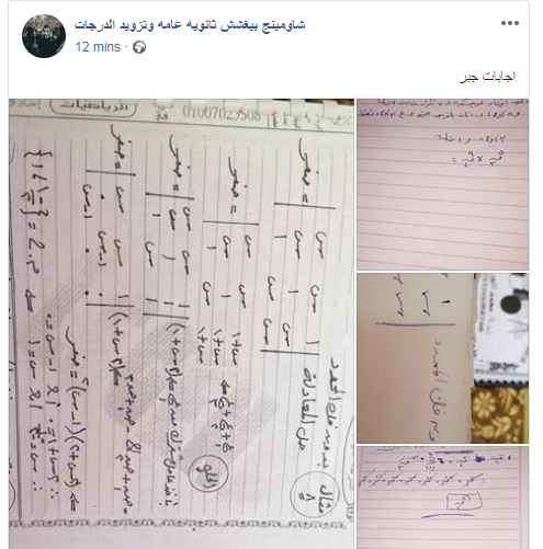 نشرت صفات الغش الالكترونى على مواقل التواصل الاجتماعى اجابات لامتحان الجبر الذى يؤدية طلاب الثانوية العامة القسم العلمى الان