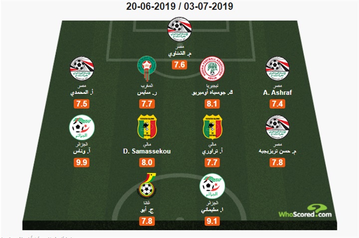 كما ضمت التشكيلة المثالية للدور الأول تواجد ثنائى منتخب الجزائر، إسلام سليمانى وأدم وناس، وجوردان أيو مهاجم منتخب غانا.