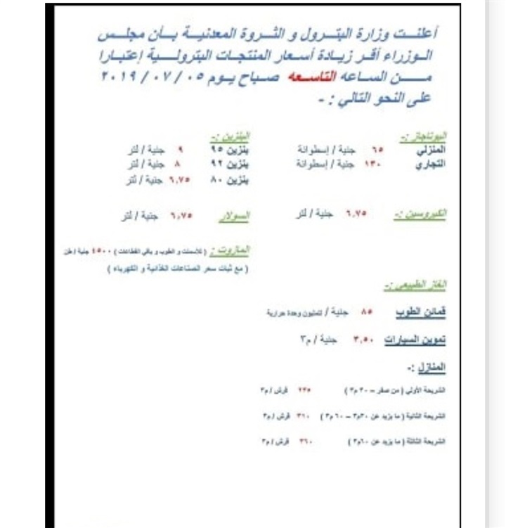 أعلنت وزارة البترول والثروة المعدنية اليوم الجمعة 5 يوليو 2019 تحريك أسعار الوقود بصف عامة شاملة اسعار البنزين 80 و92 واسطوانات البوتوجاز وذلك ضمن آليةالتسعير التلقائي التى أقرتها الوزارة في يناير الماضي.