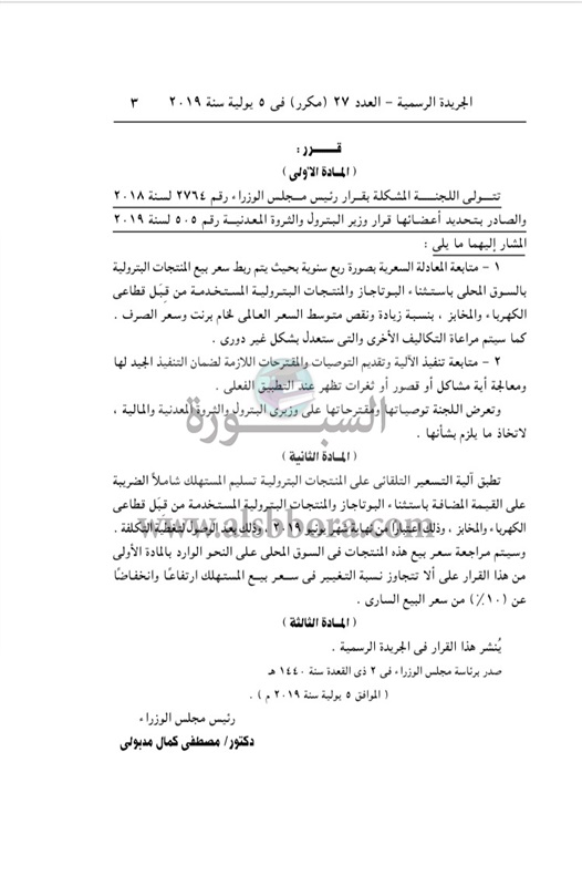 نشرت الجريدة الرسمية قرار الدكتور مصطفى مدبولى، رئيس الوزراء، بتولى لجنة متابعة التسعير التلقائى للمواد البترولية التى كان قد صدر قرار بتشكيلها، متابعة المعادلة السعرية بصورة ربع سنوية بحيث يتم ربط سعر بيع المنتجات البترولية بالسوق المحلى باستثناء البوتاجاز والمنتجات البترولية المستخدمة من قبل قطاعى الكهرباء والمخابز بنسبة زيادة ونقص متوسط السعر العالمى لخام برنت وسعر الصرف، كما ستم مراعاة التكاليف الأخرى والتى ستعدل بشكل غير دورى.