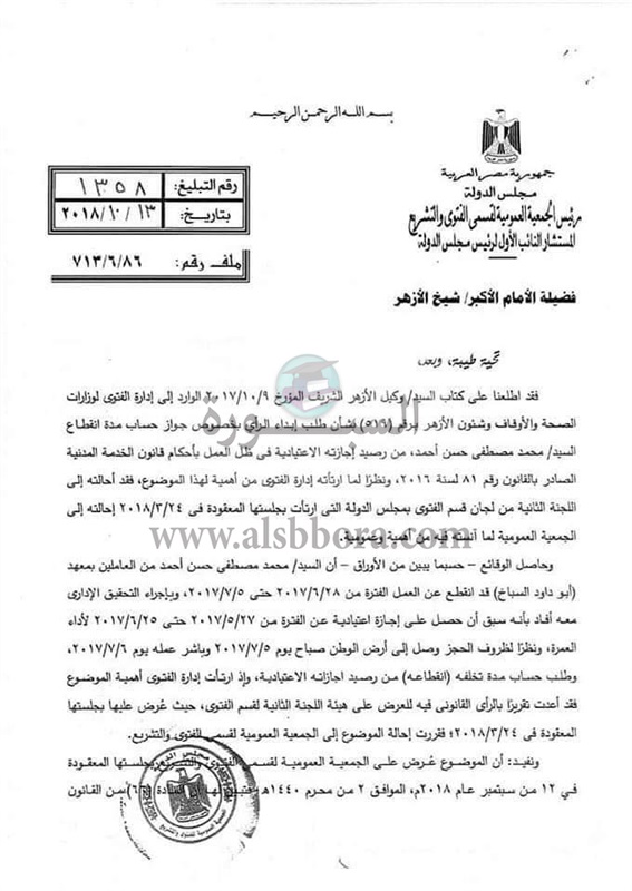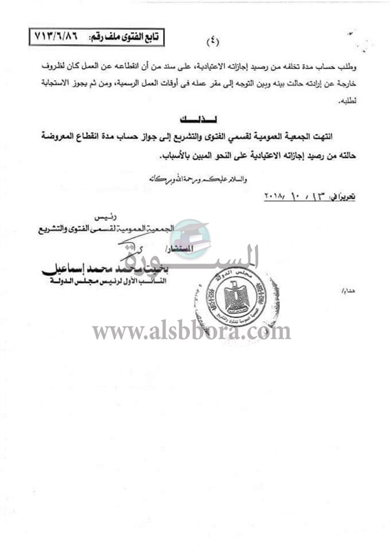 انتهت الجمعية العمومية لقسمى الفتوى والتشريع بفتواها رقم 1358 لسنة 2018 بتاريخ فتوى : 2018/10/13 و تاريخ جلسة : 2018/09/12 و رقم الملف : 86/6/713 الى :إلى جواز حساب مدة انقطاع المعروضة حالته من رصيد إجازاته الاعتيادية