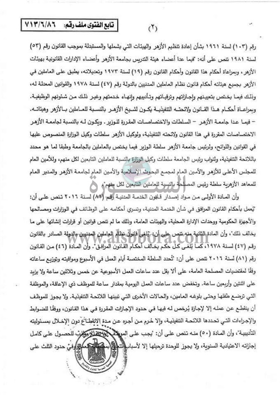 حيث استظهرت الجمعية العمومية أن المشرع فى قانون الخدمة المدنية المشار إليه ناط بالسلطة المختصة بكل وحدة من الوحدات المخاطبة بأحكام هذا القانون تحديد أيام العمل فى الأسبوع، ومواقيته، وتوزيع ساعاته، وفقًا لما تقتضيه المصلحة العامة، على ألا يقل عدد ساعات العمل الأسبوعية عن خمس وثلاثين ساعة ولا يزيد على اثنتين وأربعين ساعة، وحظر على الموظف الانقطاع عن عمله إلا لإجازة يرخص له فيها فى حدود الإجازات المقررة قانونا، وإلا حرم من أجره عن مدة الانقطاع دون إخلال بمسئوليته التأديبية، .