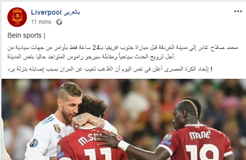 كشفت صفحة ليفربول على موقع التواصل الاجتماعى "فيس بوك" ان محمد صلاح غادر إلى مدينة الغردقة قبل مباراة جنوب افريقيا بـ24 ساعة فقط ،من أجل ترويج الحدث سياحياً ومقابلة سيرجو راموس المتواجد حاليا بنفس المدينة.