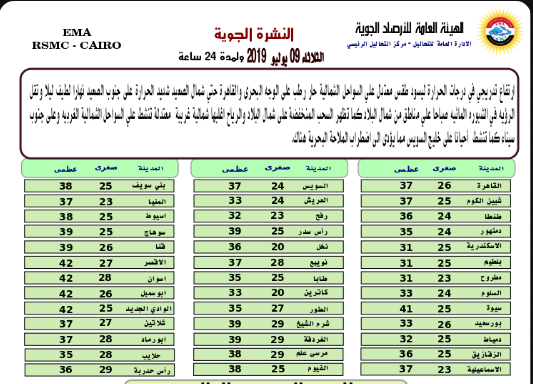 حذر خبراء هيئة الأرصاد الجوية، من ارتفاع جديد لدرجات الحراراة ، حيث من المتوقع أن يسود غدًا الثلاثاء،طقس معتدل على السواحل الشمالية حار رطب على الوجه البحرى والقاهرة حتى شمال الصعيد، شديد الحرارة على جنوب الصعيد نهارا لطيف ليلا.