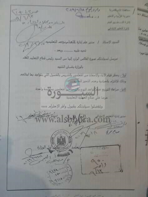 مرسل لسيادتكم صورة الفاكس الوارد إلينا من السيد رئيس قطاع التعليم العام بالوزارة بشأن التنبيه علي الأتي:
