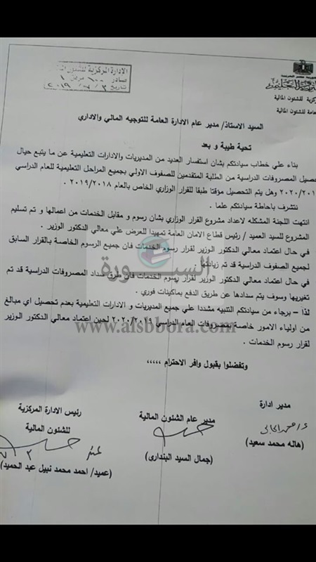 قامت وزارة التربية والتعليم بارسال منشورًا عامًا لجميع مديريات التربية والتعليم التابعة لها بالمحافظات بشأن حظر جمع مصروفات من أولياء الامور قبل النشرة الرسمية بالرسوم التي تحددها الوزارة