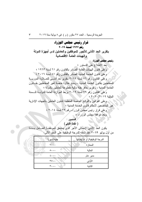 نشرت الجريدة الرسمية قرار رئيس مجلس الوزراء الدكتور مصطفى مدبولي، رقم 1627 لسنة 2019، بتقرير الحد الأدنى لأجور الموظفين والعاملين لدى أجهزة الدولة والهيئات العامة الاقتصادية، من المخاطبين بقانون الخدمة المدنية، وغير المخاطبين به، وفقا للقانون رقم 79 لسنة 2019 الخاص بربط الموازنة العامة للدولة للسنة المالية 2019-2020.