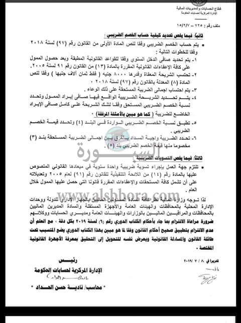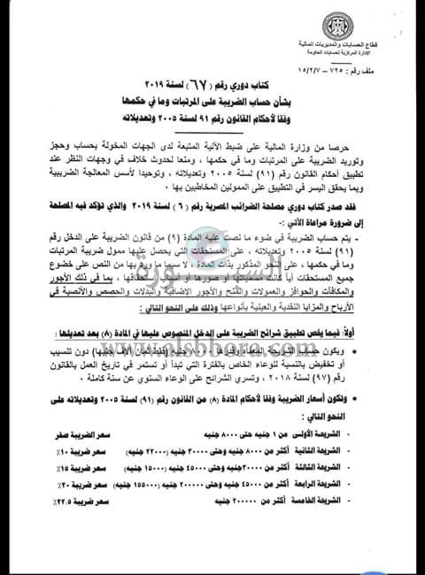 أصدرت وزارة المالية كتاب دوري 67 لسنة 2019 بشأن كيفية حساب الضريبة على المرتبات وقد جاءت التعليمات الجديدة طبقا لنص القرار كالاتي:
