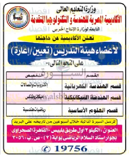 تعلن وزارة التعليم العالى والبحث العلمى عن حاجة الاكاديمية المصرية للهندسة والتكنولوجيا المتقدمة الى اعضاء هيئة التدريس من المصريين وعلى الراغبين للحصول على الوظيفة ارسال السيرة الذاتية عبر العنوان المنشور فى اعلان جريدة الاهرام اليوم الجمعة الموافق 12 يوليو 2019.