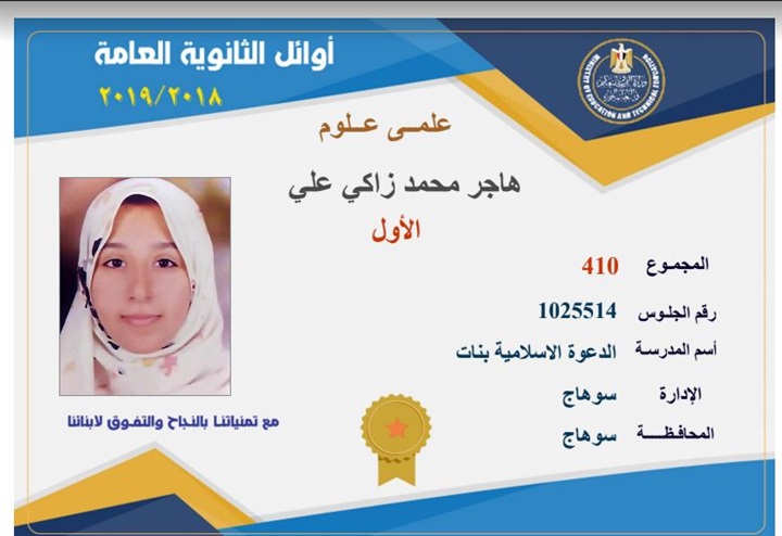 بادرتنا هاجر بقولها أننى لم اكن اتوقع حصولى على المركز الأول ولكنى كنت متاكدة اننى واحدة م من العشر الأوائل على مستوى الجمهورية فانا اثق فى الله ثم فى نفسى واجاباتى تماما