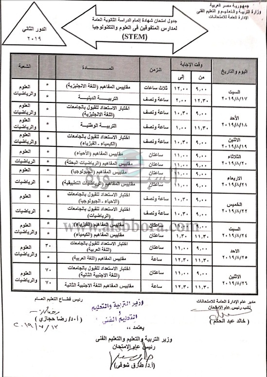 كما اعتمد الوزير، جدول امتحانات الدور الثاني لشهادة إتمام الدراسة الثانوية العامة لمدارس المتفوقين في العلوم والتكنولوجيا (STEM)، وجدول امتحانات الدور الثاني لشهادة إتمام الدراسة الثانوية العامة للمكفوفين.