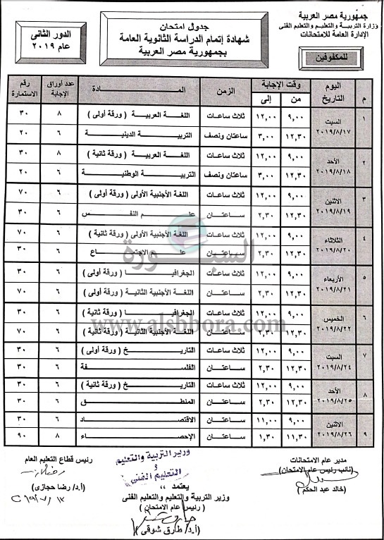 اعتمد الدكتور طارق شوقي وزير التربية والتعليم، جدول امتحانات الدور الثاني لشهادة إتمام الدراسة الثانوية العامة للعام الدراسي 2018 /2019.