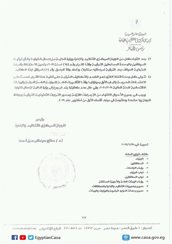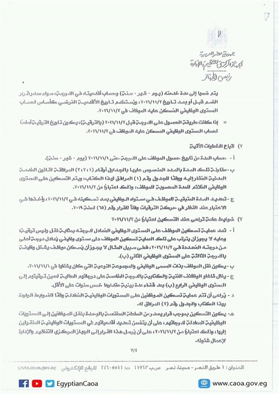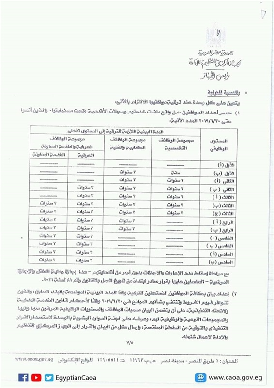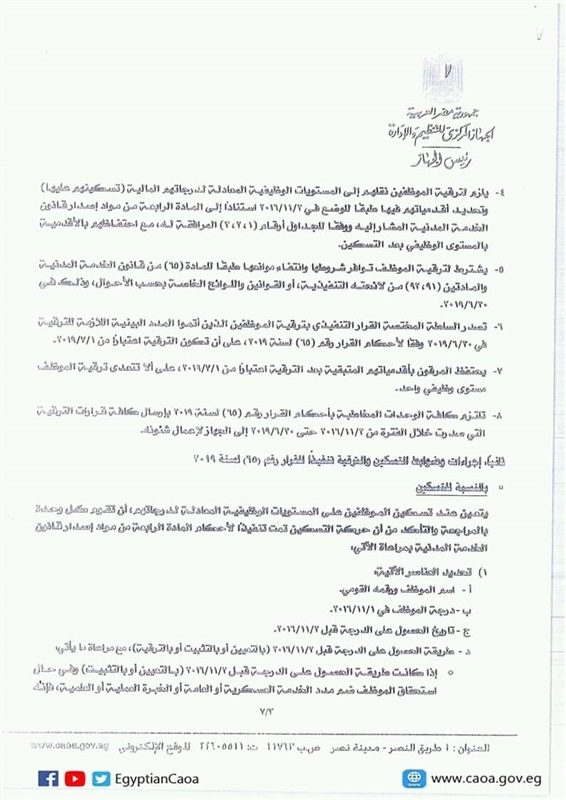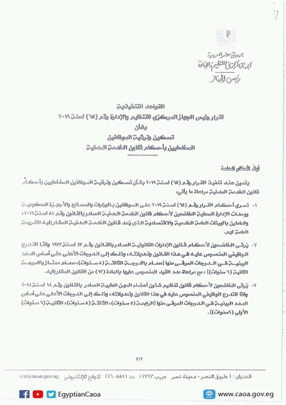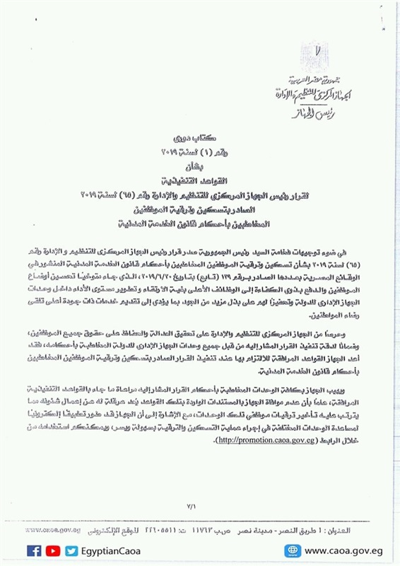 اعلن الجهاز المركزى للتنظيم والإدارة،انه تم ارسال القواعد التنفيذية لقرار رئيس الجهاز رقم 65 لسنة 2019 الصادر بتسكين وترقية الموظفين المخاطبين بأحكام قانون الخدمة المدنية إلى الوزارات والمحافظات والهيئات والجامعات والجهات المعنية بتطبيق القرار، والتي أصدرها في كتاب دوري رقم 1 لسنة 2019.