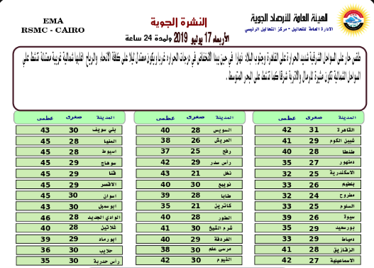 كشف خبراء هيئة الأرصاد الجوية،عن حاله الطقس غدًا الأربعاء، حيث من المتوقع ان يسود طقس حار على السواحل الشرقية شديد الحرارة على القاهرة وجنوب البلاد نهارا، فى حين يبدأ الانخفاض فى درجات الحرارة غربا ويكون معتدل ليلا على كافة الانحاء، والرياح أغلبها شمالية غربية معتدلة تنشط على السواحل الشمالية تكون مثيرة للرمال والأتربة شرقا، كما تنشط على البحر المتوسط.
