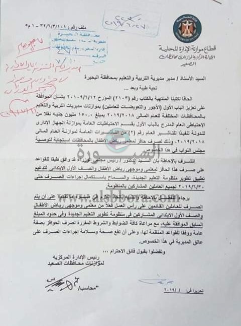 اصدرت وزارة المالية قرارا جديدا بشأن صرف حافز معلمى رياض الاطفال والصف الاول الابتدائى والمقدر بـ 1000 جنيه حيث اعطت وزارة المالية تعليمات جديدة جاءت خلال المستند التالى: