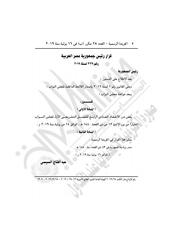 نشرت الجريدة الرسمية في عددها رقم 28 مكرر (ب)، الصادر في 16 يوليو 2019، قرار الرئيس عبدالفتاح السيسي، بشأن فض دور الانعقاد العادي الرابع للفصل التشريعي الأول لمجلس النواب، اعتبارًا من يوم الإثنين 12 من ذي القعدة، الموافق 15 يوليو سنة 2019.