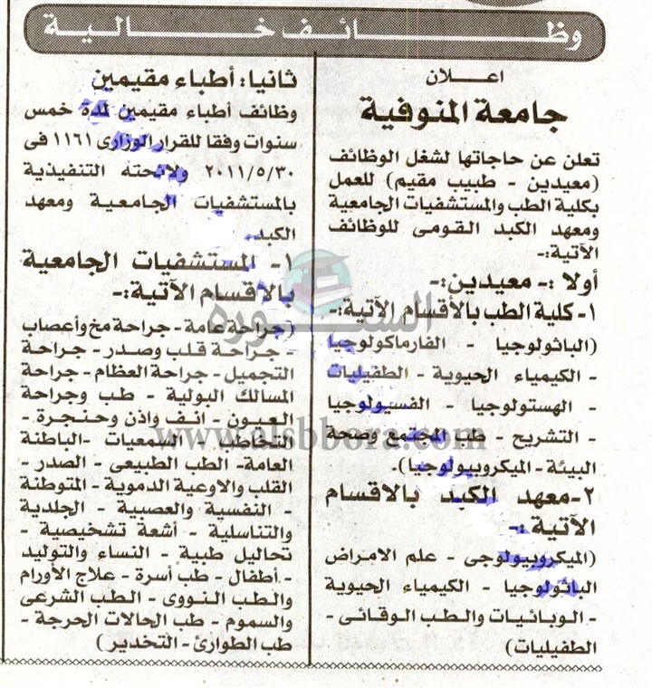 جامعة المنوفية تعلن حاجتها الى اعضاء هيئة التدريس من المعيد الى الاستاذ