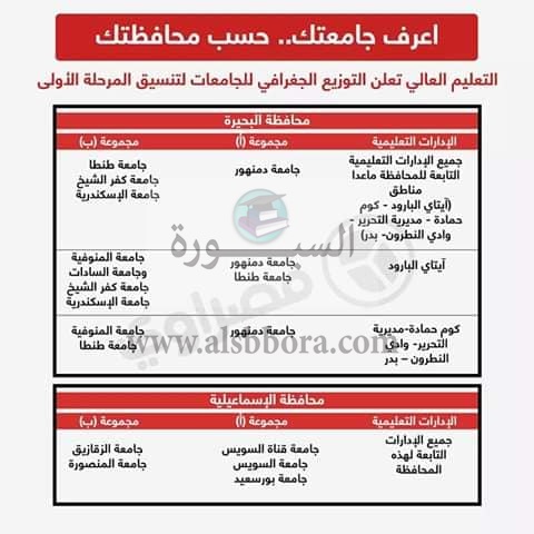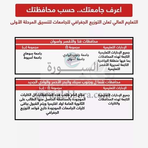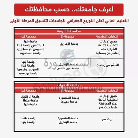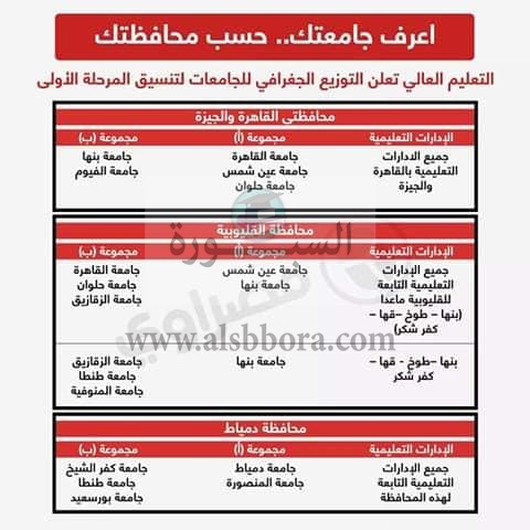 اعلنت وزارة التعليم العالى والبحث العلمى عن التوزيع الجغرافى للجامعات لتنسيق المرحلة الاولى لطلاب الثانوية العامة الذين سوف يلتحقون بالجامعات للعام الدراسى الجديد 2020/2019، حيث جاء التوزيع الجغرافى عن طريق انفوجراف كالتالى: