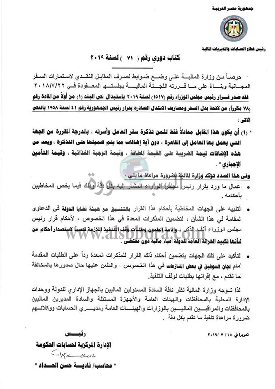 اصدر مجلس الوزراء قرارا رقم 1517 لسنة 2019 باستبدال نص البند رقم 1 من اولا من المادة رقم 78 مكرر من لائحة بدل السفر ومصاريف الانتقال الصادرة بقرار رئيس الجمهورية رقم 41 لسنة 1958 بالنص الاتى: