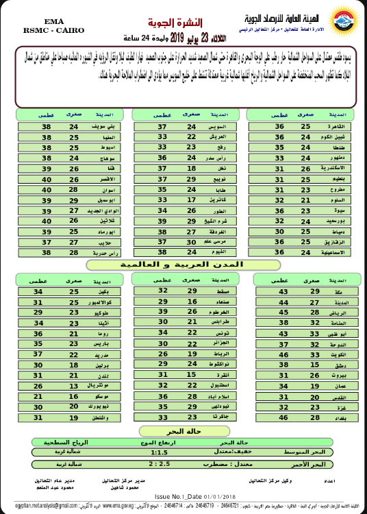 اعلن خبراء هيئة الأرصاد الجوية أنه من المتوقع ان يسود اليوم الثلاثاء، طقس معتدل على السواحل الشمالية حار رطب على الوجه البحرى والقاهرة حتى شمال الصعيد، شديد الحرارة على جنوب الصعيد نهارا لطيف ليلا.