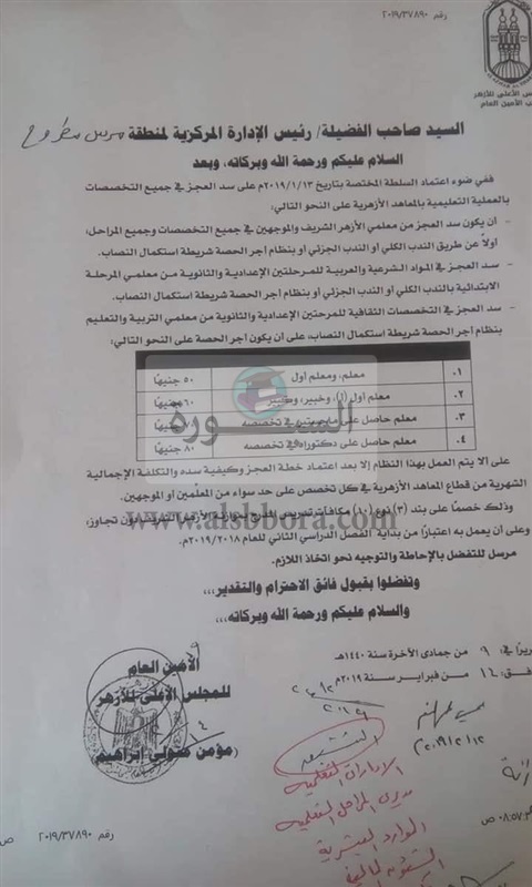 الأزهر الشريف منح المعلمين حصصا إضافية فوق المخصصة لهم، مقابل مبالغ مالية عن كل
