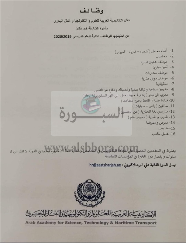 اعلنت الاكاديمية العربية للعلوم والتكنولوجيا والنقل البحرى بامارة الشارقة عن عدد من الوظائف كما بالاعلان التالى