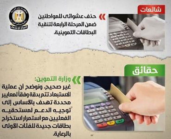 كشف مركز المعلومات بمجلس الوزراء عن حقيقة الحذف العشوائى للمواطنين ضمن المرحلة الرابعة لتنقية البطاقات التموينية.