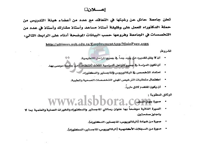 تعلن جامعة حائل بالمملكة العربية السعودية عن حاجتها الى اعضاء هيئة التدريس من المصريين من المعيد الى الاستاذ، وعلى الراغبين فى الحصول على الوظيفة الدخول على الموقع التالى: http://ultimus.uoh.edu.sa/Employmentapp/mainpage.aspx