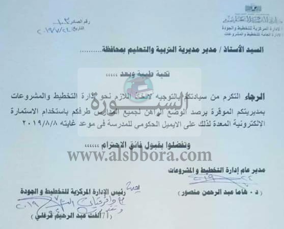 اصدرت وزارة التربية والتعليم امر اداريا الى جميع مديريات التربية والتعليم بارسال خطابا الى مديرى المدارس على مستوى الجمهورية بشأن التوجه لاتخاذ اللازم نحو ادارة التخطيط والمشروعات بمديريتكم من اجل رصد الوضع الراهن لجميع المدارس من طرفكم باستخدام الاستمارة الالكترونية المعدة لذلك على الايميل الحكومى للمدرسة فى موعد غايته 8 اغسطس 2019.