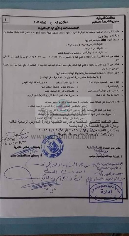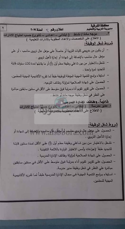 اعلنت مديرية التربية والتعليم بمحافظة الشرقية عن حاجتها الى موجه وموجه اول و موجه عام تخصصات مختلفة عام وفنى، مدير ووكيل مدرسة جميع المراحل عام وفنى، والتفاصيل والشروط والمستندات المطلوبة معلنة بلوحة الاعلانات بالمديرية .