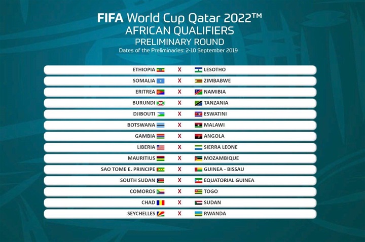 واسفرت قرعة الدور الاول للتصفيات المؤهلة الى بطولة كأس العالم بقطر 2022، والتى جاءت كالتالى: زيمبابوي مع الصومال، بوروندي مع تنزانيا، وجيبوتي مع سواتيني "سوازيلاند سابقاً"، واريتيريا مع ناميبيا، واثيوبيا مع ليسوتو، بوتسوانا مع مالاوي، وجامبيا مع أنجولا، ليبيريا مع سيراليون، وموريتانيا مع موزمبيق، وساوتومي مع غينيا بيساو، وجنوب السودان مع غينيا الاستوائية، والسودان مع تشاد، وسيشيل مع رواندا، جزر القمر مع توجو.