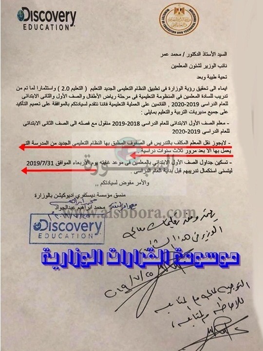 ارسلت وزارة التربية والتعليم والتعليم الفنى، خطابا الى جميع المديريات التعليمية بشأن عدم نقل معلم الصف الاول المتدرب على المنظومة الجديدة قبل 3 سنوات، وجاء الخطاب كالتالى: