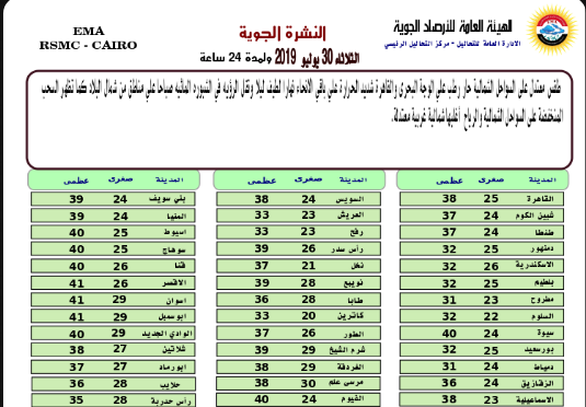 حذر خبراء هيئة الأرصاد الجوية المواطنين من طقس اليوم الثلاثاءحيث يسود طقس معتدل على السواحل الشمالية حار رطب على الوجه البحرى والقاهرة شديد الحرارة على باقى الانحاء نهارا لطيف ليلا.