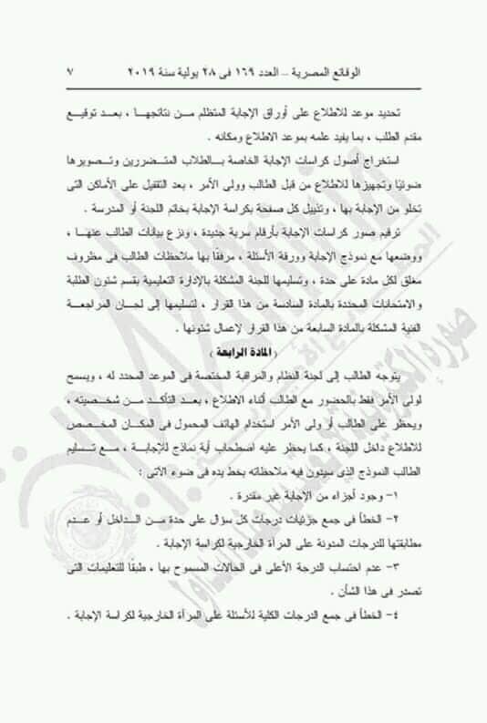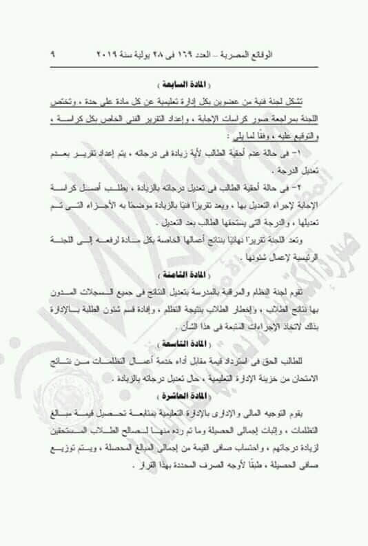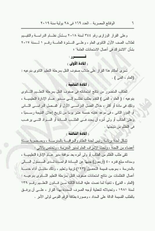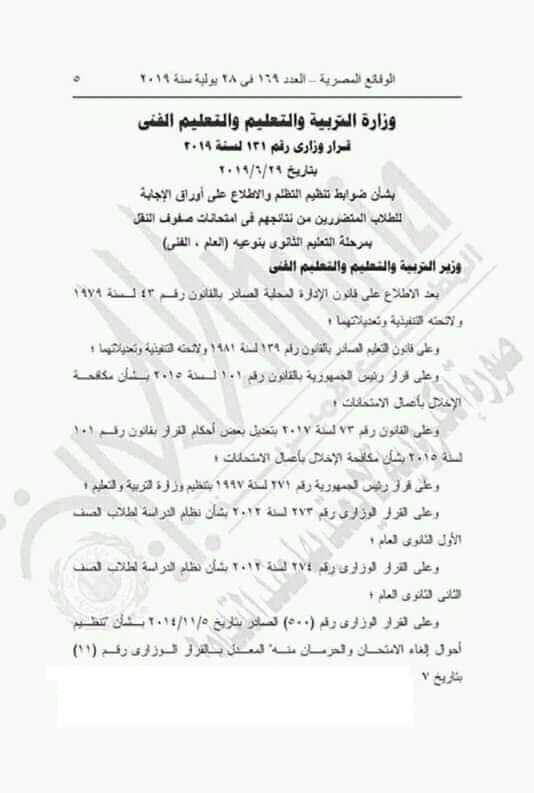 نشرت الجريدة الرسمية قرارا وزاريا جديدا للدكتور طارق شوقى وزير التربية والتعليم والتعليم الفنى رقم 131 لسنة 2019 بشأن تظلمات الثانوية العامة، وجاء القرار حسب ما نشرته الجريدة الرسمية كالتالى: