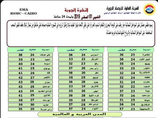 كما تقل الرؤية في الشبورة المائية صباحا علي مناطق من شمال البلاد، وتظهر السحب المنخفضة على السواحل الشمالية والرياح أغلبها شمالية غربية معتدلة.