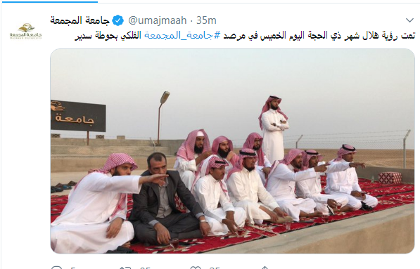وقال الحساب الرسمي لجامعة المجمعة على "تويتر" :" تمت رؤية هلال شهر ذي الحجة اليوم الخميس في مرصد جامعة المجمعة الفلكي بحوطة سدير".