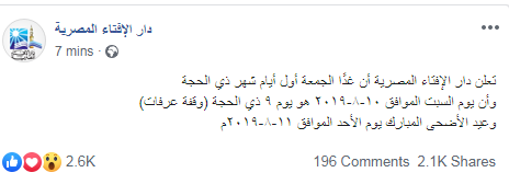 اعلنت دار الإفتاء المصرية أن غدًا الجمعة أول أيام شهر ذي الحجة ،وأن يوم السبت الموافق ١٠-٨-٢٠١٩ هو يوم ٩ ذي الحجة (وقفة عرفات)