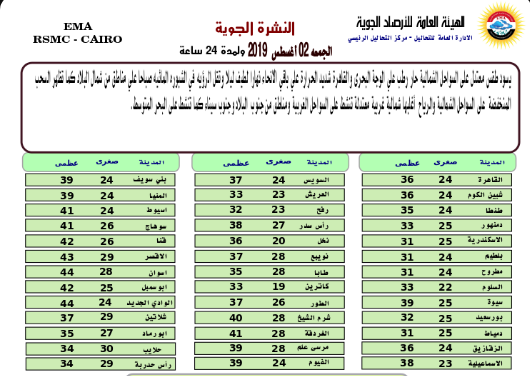 اعلن خبراء هيئة الأرصاد الجوية، أنه من المتوقغ ان يسود غدًا الجمعة، طقس معتدل على السواحل الشمالية، حار رطب علي الوجة البحرى والقاهرة، شديد الحرارة علي باقي الانحاء نهارا لطيف ليلا.