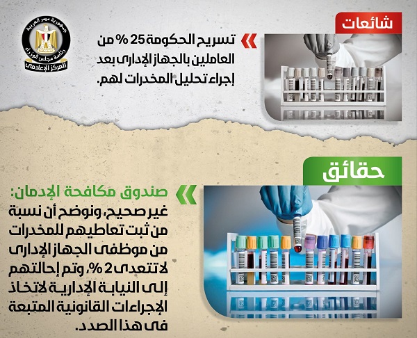 كشف مركز المعلومات بمجلس الوزراء عن الاخبار المتداولة بشأن تسريح الحكومة 25% من العاملين بالجهاز الادارى بعد اجراء تحليل المخدرات لهم.